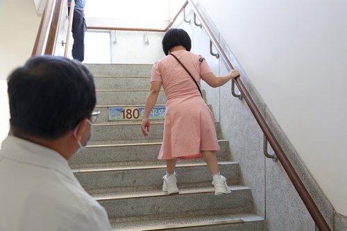 ▲物理治療師徐佳俐教導陳團治利用彈力帶訓練腿部力量