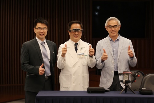 ▲林欣榮院長戴上AR眼鏡,體驗「AR智能解說員」,不僅可以向民眾推廣捐贈造血幹細胞的善舉,並解答相關問題以及釐清可能的疑惑。
