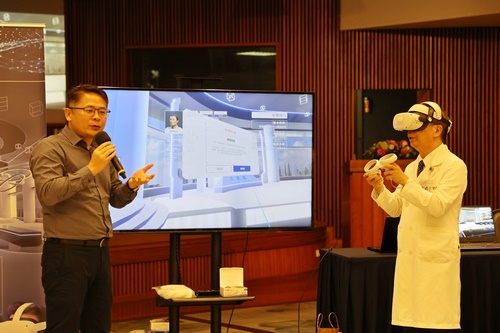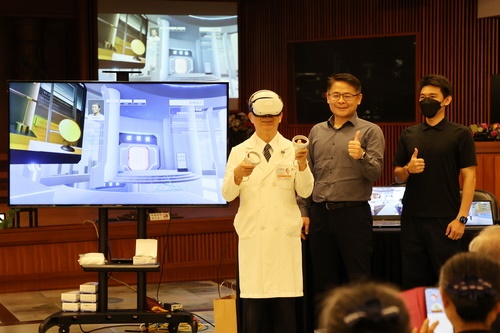 ▲吳彬安副院長(右)體驗「造血幹細胞捐贈元宇宙」跨平台系統。