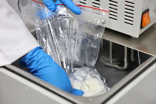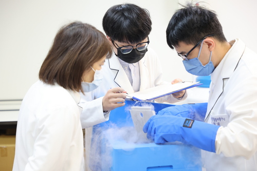 圖說:2024年1月2日上午,醫療團隊及幹細胞研製中心團隊接力,將CAR-T細胞出庫後送往二一東骨髓移植病房,需經過解凍、核對等程序。(攝影/陳安俞)