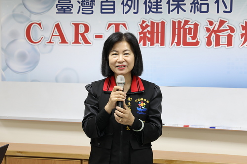 特別穿上紅色衣服祝福張女士重生的花蓮縣衛生局副局長鍾美珠說,感恩健保署看見民眾、病人的需求並提供健保給付,全臺灣僅有7家醫院能做CAR-T治療,得知張女士遠從臺南來到花蓮就醫,對於病人信任花蓮慈院、李啟誠主任的團隊以及整個花蓮慈院的照護等,讓身為花蓮人的她感到非常驕傲。