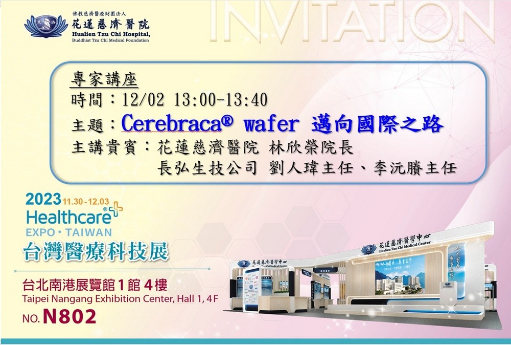 目前復發惡性腦膠質瘤的治療效果有限,迫切需要新的治療方法。12月02日下午1點,由院長林欣榮以及長弘生技公司團隊於台北南港展覽館1館4樓,2023台灣醫療科技展的花蓮慈院展位(N802)分享惡性腦瘤標靶新藥最新進展「Cerebraca® Wafer邁向國際之路」。