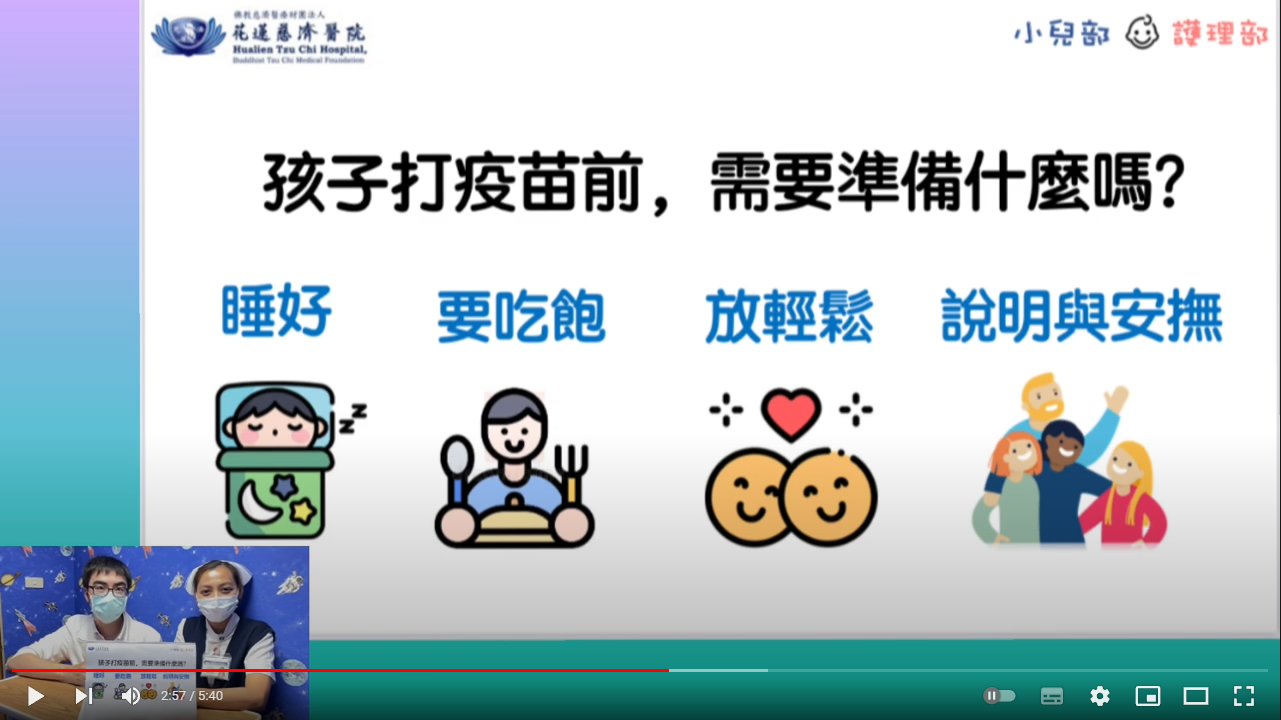 小兒部蕭宇超醫師也提醒,若是兒童在接種疫苗上還有疑慮,都可以諮詢小兒科醫師來評估是否適合打疫苗;也建議讓小朋友在打疫苗的前一晚要睡飽,早、午餐都要吃飽,除此之外,家長也要提醒孩子放輕鬆,最重要的是花點時間跟孩子說明打疫苗的情況,相信在溝通與安撫後,小朋友會更有信心面對疫苗接種。