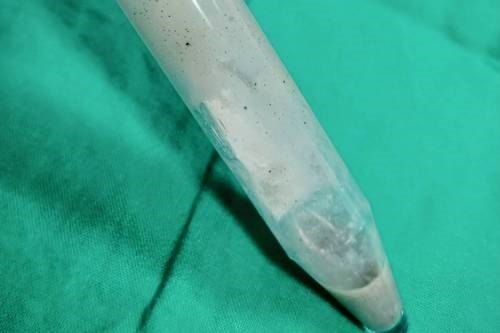 右圖:第一次支氣管鏡檢查,清理出不少混有泥沙細石的濃痰。(攝/康葭蓁)