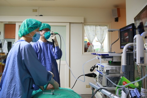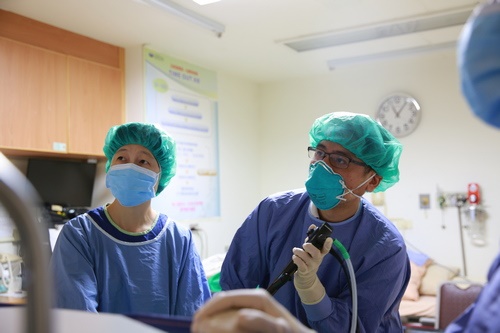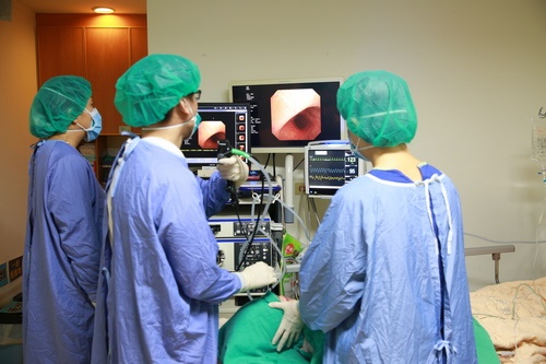左圖:花蓮慈院胸腔內科醫師楊朝能與團隊緊急以支氣管鏡進行「清淤」,協助病人逐步恢復順暢呼吸。(攝/江家瑜)