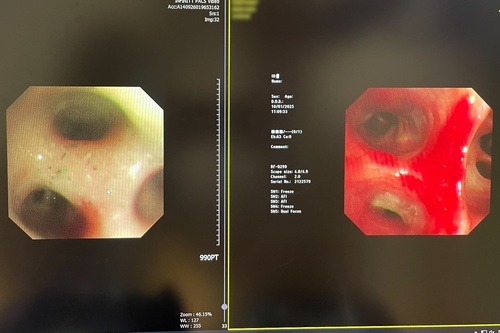 楊朝能醫師回憶,第一次清理時宛如為肺部「清淤」,從病人的鼻咽、喉咽,一路到左右支氣管,都堆積了大量濃痰與泥沙。團隊在不傷害呼吸道的情況下,盡可能移除細沙,考量殘留泥沙會隨分泌物逐步排出,一週後再次進行第二次支氣管鏡檢查與清理;這時從支氣管鏡檢查中,可以看出氣管已明顯乾淨許多,濃痰與泥沙大幅減少,黏膜也開始修復,患者呼吸狀況大幅改善。