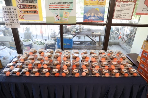圖說:花蓮慈院致贈光復鄉親以及協力單位350份紅蛋和桂圓糕,象徵重生與福慧雙修的祝福。