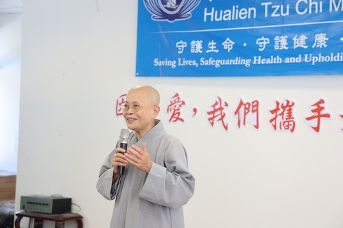德懷法師代表證嚴上人送上對鄉親及醫療站的祝福。德懷法師開示,慈善醫療同行,心靈關懷是最重要的。這段時間看到災民從心情震撼到平穩,相信是大醫王和白衣大士守護生命守護健康守護愛的努力成果,醫療是長情大愛,之後中長期希望慈善醫療合作,讓居民可以安身又安心。