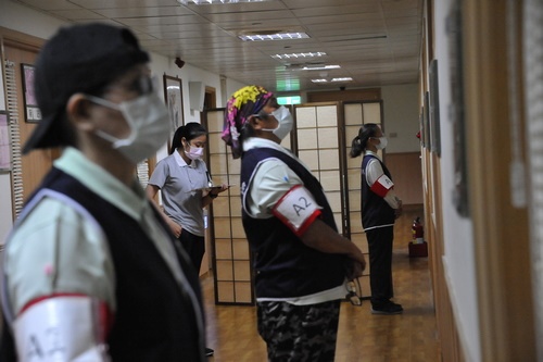 ▲花蓮慈院長照服務OSCE情境模擬演練工作坊,仿國考考試規格,學員考前需考場外等待,也不能攜帶手機入場,照片中臂章A2為長期照護部張隆財居家服務員。(廖文聰攝)