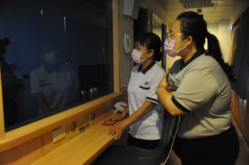 ▲慈濟大學謝美玲老師(左)、與花蓮慈院長照部主任林宜靜,在考場外觀察引導師(考官)、模擬案家、與學員互動。(廖文聰攝)