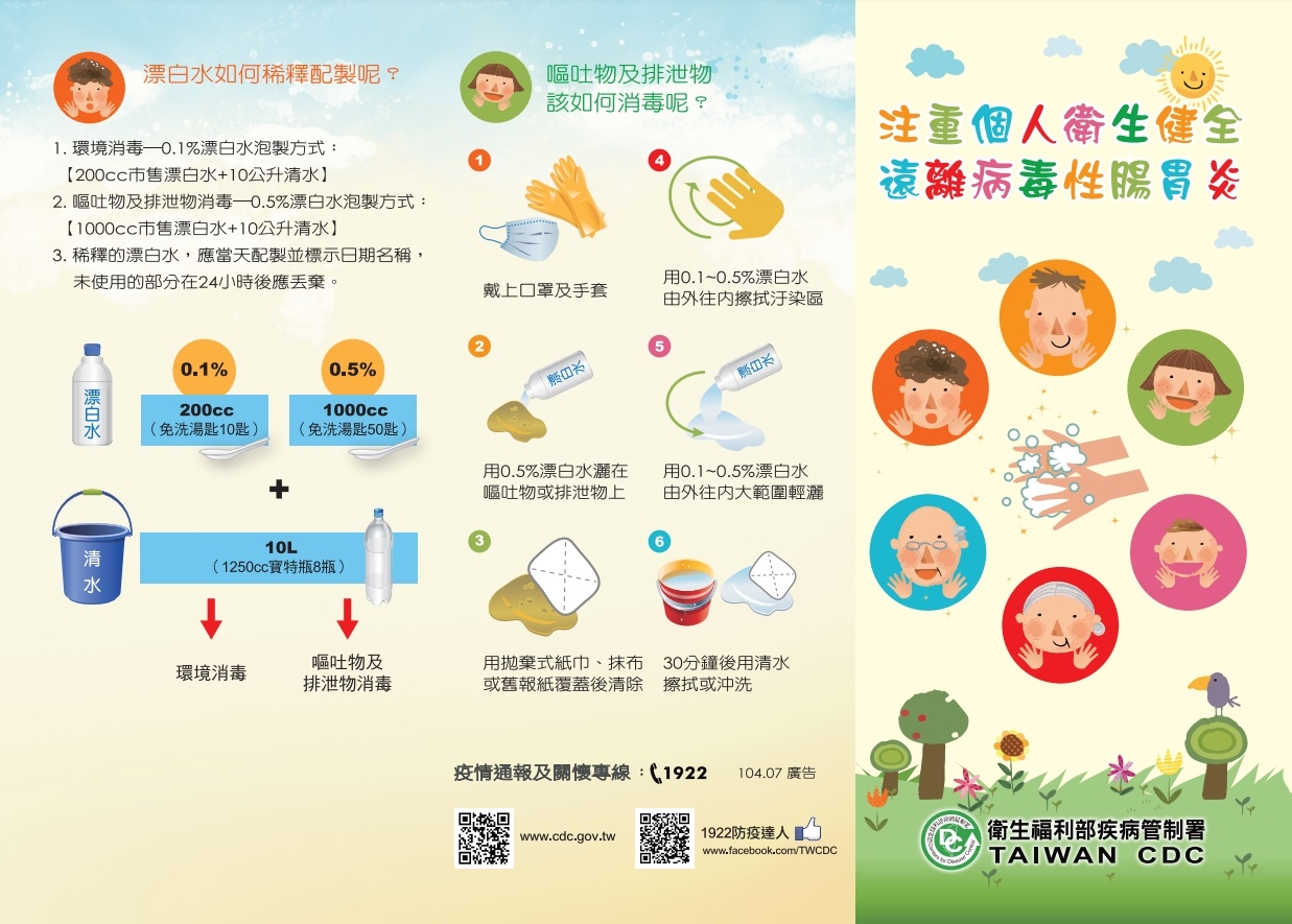 漂白水的稀釋配置可以參考疾病管制署(https://www.cdc.gov.tw/)的建議,將200c.c.(免洗湯匙*10匙)的漂白水加入10公升的清水(1250c.c.的寶特瓶*8瓶),配製成0.1%的漂白水進行環境消毒;如果是已經感染腸病毒的病童,在清理嘔吐物及排泄物的時候,則要使用將1000c.c.(免洗湯匙*50匙)的漂白水加入10公升的清水(1250c.c.的寶特瓶*8瓶),配製成0.5%的漂白水進行消毒。