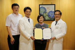 花蓮慈院林欣榮院長與何宗融副院長送上感謝狀,感恩高雄的實業家楊順合與薛淑眞捐贈五項價值約一百八十五萬的中醫臨床及實驗使用儀器,包含臨床使用的舌部影像擷取與特徵分析儀、心律大師腕式生理監視器、DigiLens微循環檢測儀以及實驗室使用的CF15RN高速冷凍離心機與Flash and preparative HPLC。