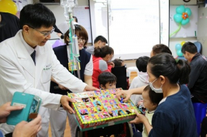 花蓮慈濟醫院兒科病房團隊三日上午邀請住院孩子、家長一起過兒童節。在慈濟科技大學護理實習生「妖怪手錶」帶動唱下,孩子們很快的融入歡樂的情境,活動中還有「抽抽樂」,親子協力「塗鴉手提袋」,一位小朋友露出滿意的笑容,跟陪伴的祖母說,他的小提袋要裝玩具。