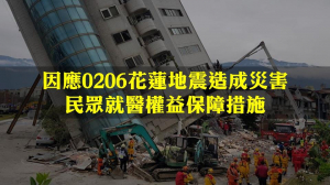 為因應0206花蓮地區地震造成部分區域建物倒塌,致民眾身體或財物損害,衛生福利部中央健康保險署表示,受災民眾若需要就醫,健保署特別呼籲各特約醫療院所對於無法取得健保卡或卡片遭毀損等暫無法持健保卡就醫者,請仍依據「例外就醫」予以受理就醫。