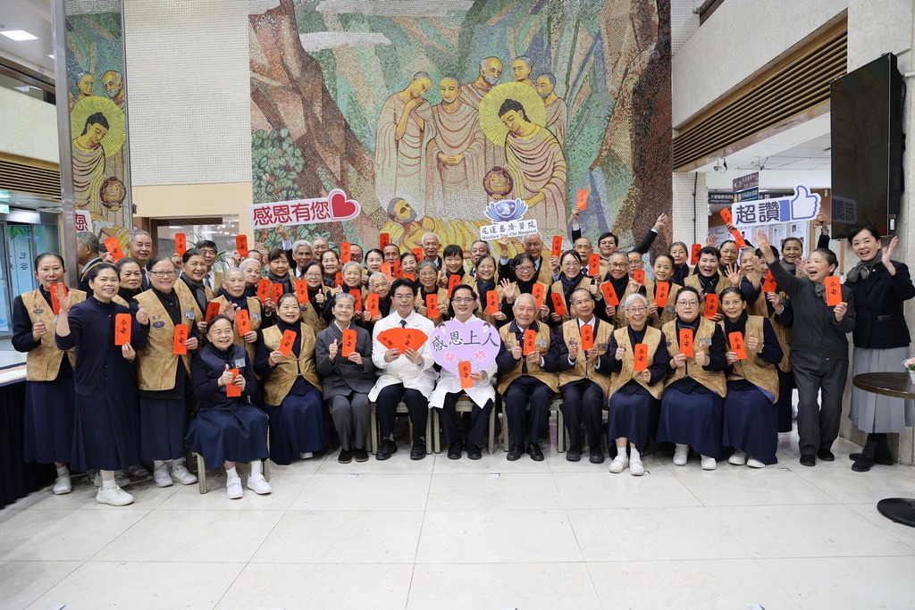 圖:林欣榮院長(前排右八)與何宗融副院長(前排右九)在上午九時,送上「平安」紅包以及證嚴上人的祝福,感恩醫療志工。(游繡華攝)