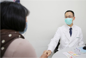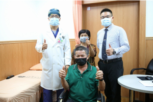 圖說:邱伯伯(中)與太太,感恩麻醉部疼痛科王柏凱主任(左)、運動醫學中心主任暨骨科醫師劉冠麟(右)。