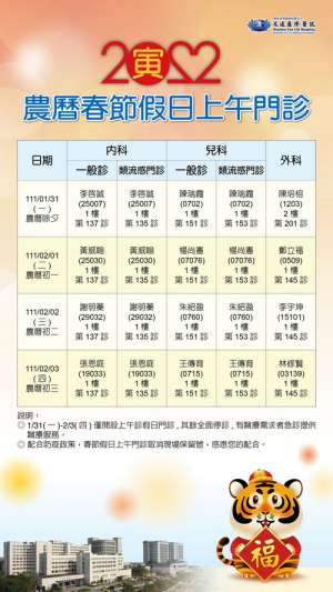 農曆春節連續假期即將到來,花蓮慈濟醫院延續往年門診服務,自1月31日(除夕)起到2月3日(年初三)開設上午假日門診,包含內科、兒科、外科及類流感門診服務;此外,春節期間急診提供二十四小時醫療服務。各醫療科門診將在2月4日(年初四)恢復正常門診。