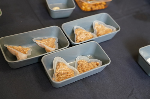 ▲3顆粽子需要六個粽膜包裝,也可用布丁盒代替粽模。 (陳炳宏攝)