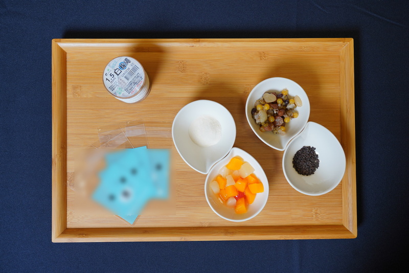 1.準備好要包入的配料(八寶豆、水果丁、山粉圓)