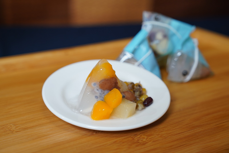 左圖:晶瑩剔透的洋菜凍包裹著豐富美味的食材,水果八寶粽營養又健康。(攝/陳炳宏)