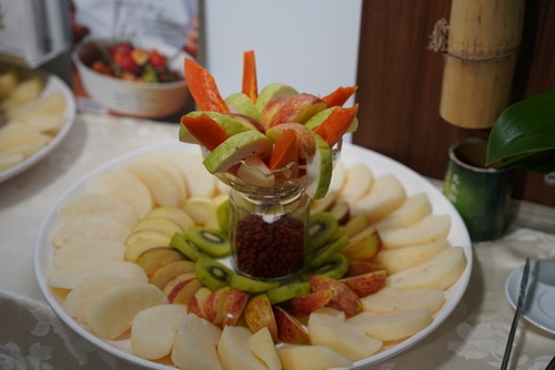圖:志工加碼的水果拼盤,顏靜曦師姊說,色彩、營養都更豐富了。