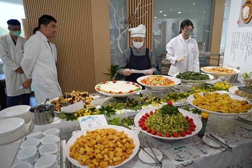 圖:在營養科實習生協助下,林欣榮院長(左圖,右一)、羅慶徽副院長(右圖,左三)都忍不住誇讚「蔬福食堂」Buffet。