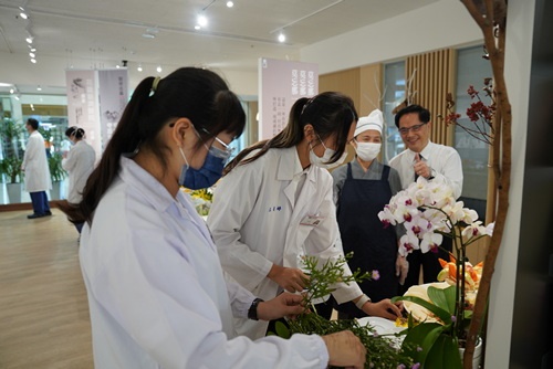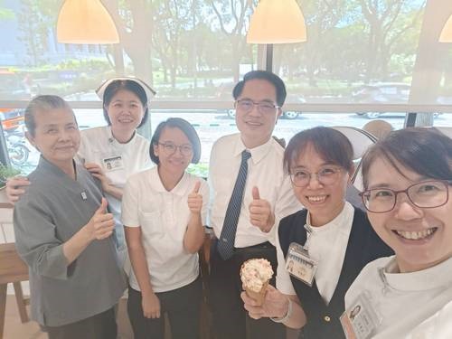 左圖:顏靜曦師姊、劉詩玉主任感恩林欣榮院長、羅慶徽副院長,帶領全院同仁茹素。