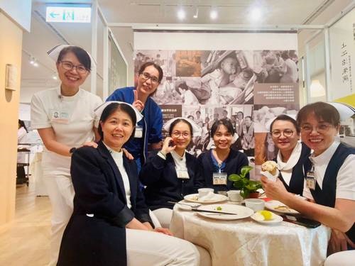 右圖:花蓮慈院志工室主任顏靜曦師姊(右一)感恩院長室主管大力支持,才能與營養科團隊聯手在大愛醫療溯源館推出「蔬福食堂」餐盒,並於29日舉行Buffet驗收。