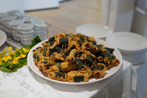 劉詩玉主任也特別介紹,這次的蔬食Buffet是由顏靜曦師姊與營養科營養師魏萌萱、蘇真瑩,實習學生林貞妮、王薇婷、黃予伶、劉卜熏、蔡佑瑄,及廚師伍麗雪、莊麗巧、柯輝妹等人共同參與,並善用同心圓、營養科廚房,花了一早上用心烹煮出充滿植物蛋白及各種營養素均衡的素食料理。(文/陳炳宏;圖/陳炳宏、人資室、護理部、顏惠美)