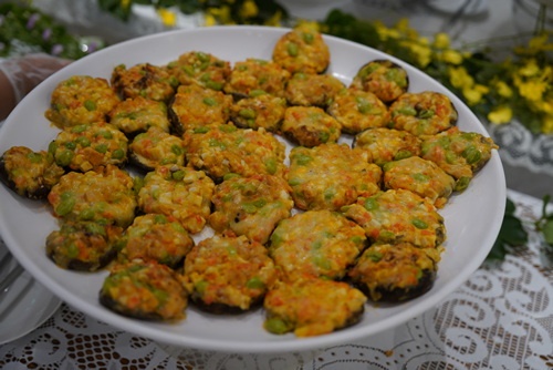 營養科蘇真瑩營養師說,發表會中的12道蔬食料理,因有些蔬菜已非這季可買到,所以有微調營養素,和過去出現在餐盒的配菜略有不同,另外還有醫療志工加碼「水果拼盤」。例如在去年「健康花慈、幸福久久」加菜的幸福甜筒,也選入這次菜單,除拌入紅蘿蔔、毛豆仁、小黃瓜丁的馬鈴薯沙拉,剛好在市場看到紫藷,不一樣的根莖類可以增加色澤。沙拉的比例是顏靜曦師姊傳授的配方,蘇真瑩強調,在與顏師姊合作的過程,獲益良多。