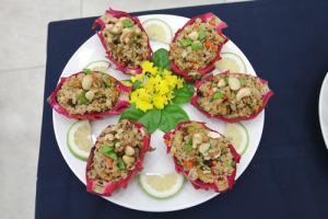 材料(30人份):*火龍果冰皮: 1.糯米粉60克 2.在來米粉40克 3.澄粉30克 4.火龍果汁約30克 5.橄欖油20克 6.糖20克*芋泥餡: 1.芋頭300克 2.橄欖油15克 3.糖60克作法: 1.將糯米粉、在來米粉、澄粉混勻,依序拌入糖、橄欖油、火龍果汁,揉成麵糰後放入電鍋蒸熟(外鍋一杯水約蒸30分鐘)。