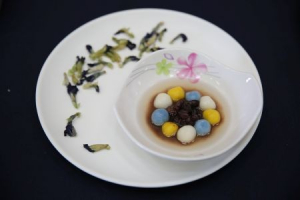 材料(30人份):1. 地瓜250克,芋頭250克2. 地瓜粉各50克3. 太白粉各50克4. 蓮子100克5. 桂圓20顆6. 紅棗100克7. 黑糖700克8.薑片半斤作法:1.將桂圓及紅棗,放進10公升水中煮滾。2.將黑糖倒入煮滾的桂圓紅棗湯中煮至溶化後,加入薑片關小火煮10-15分鐘。3.蓮子蒸熟放涼備用 。