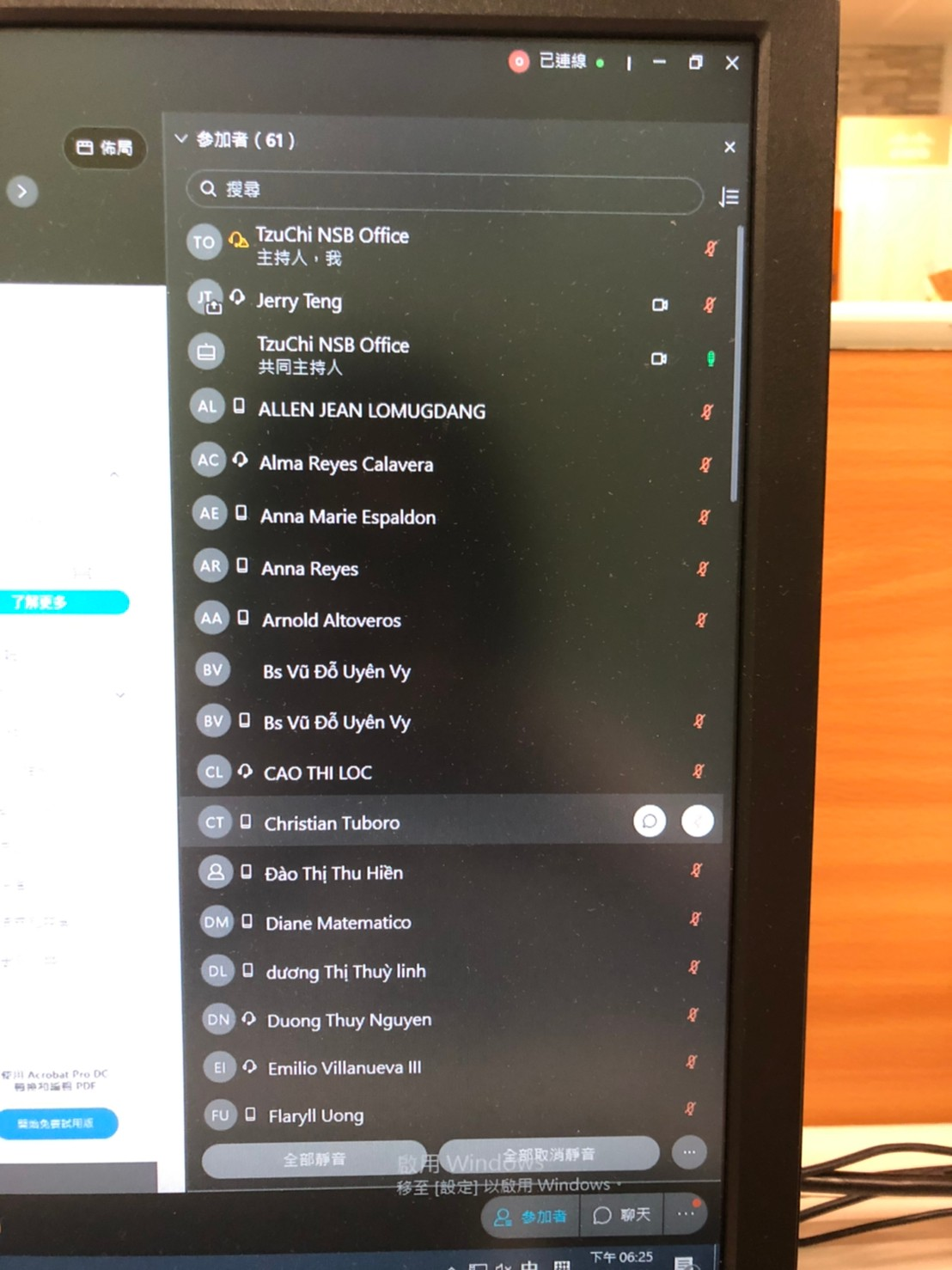 骨髓移植技術於菲律賓尚屬待發展項目,自花蓮慈濟醫院承接醫衛新南向計畫以來,我們積極協助菲律賓建構更加完整的骨髓移植技術,近年也有多位菲律賓籍代訓醫師透過新南向計畫管道申請來本院血液腫瘤科學習,雙方於結訓回國後也保持良好互動及友誼,自2020年起,新冠肺炎疫情肆虐全球,各國均實施嚴格境管,代訓醫師皆無法順利入境學習,為因應此情形,以及持續與新南向醫事人員保持緊密互動,花蓮慈濟醫院-國際醫學中心-新南向辦公室自2021年5月起規劃一系列常態性骨髓移植講座,活動中廣邀台灣多位專家一同進行教學,並於2021/08/04(三)舉辦新南向造血幹細胞移植遠距進階跨國講座: Myeloablative Conditioning for Hematological Malignancies,本次活動特別邀請台中榮民總醫院血液腫瘤科滕傑林主任、花蓮慈濟醫院國際醫學中心李啟誠主任、血液腫瘤科黃威翰醫師、感染科鄭順賢醫師擔任講者,講者滕傑林主任為血液腫瘤專家,於講座中向參與者進行幹細胞移植的教學,也講解移植後併發症的案例,同時也製作精美圖表,與參與者分享重要數據,本新南向造血幹細胞移植遠距進階跨國講座參與者包括菲律賓血液學教母Dr. Norma Ona,以及The Medical City醫療團隊Dr. Alma Reyes Calavera、National Kidney and Transplant Institute (NKTI)醫療團隊等人,同時,本中心在多位菲籍代訓醫師學成歸國後,仍與其保持緊密友誼,本次講座也邀請剛從花蓮慈濟醫院學成歸國之菲方代訓醫師Dr. Anna Marie D. Espaldon、Dr. Emilio Q. Villanueva III一同參與,也邀請待日後疫情結束規劃前往花蓮慈濟醫院受訓之Rizal Medical Center Dr. Rosalyn Valerie Villanueva一同參與此次活動,本講座為常態性活動,利用安全視訊方式,持續與新南向友國醫事人員保持互動,並完成協助新南向友國醫衛人員代訓目標,本次新南向造血幹細胞移植遠距進階跨國講座參與人數: 菲律賓、印尼、越南61人台方5人,共計66人參與。