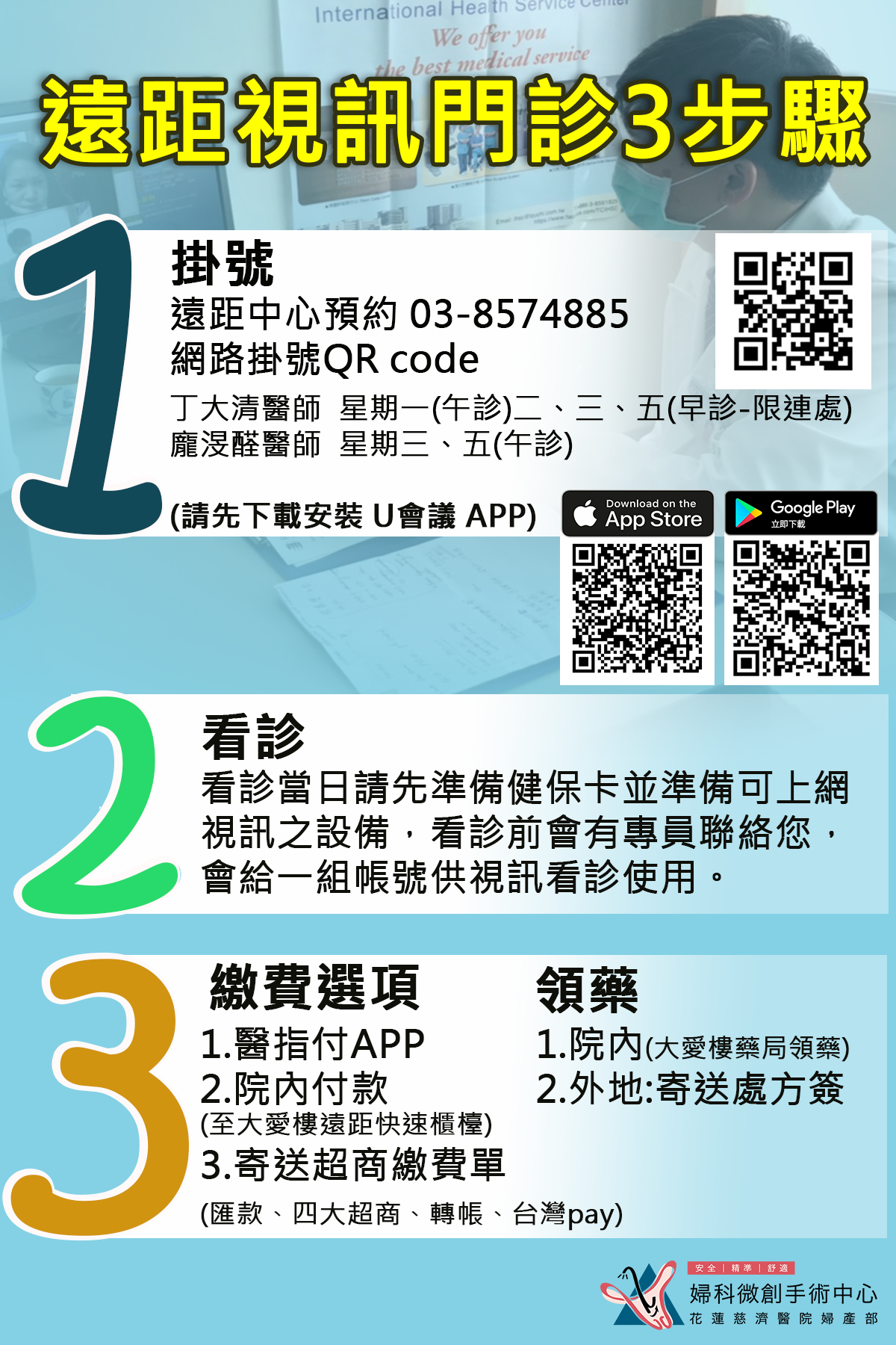 因應新冠病毒疫情的昇溫,本院婦產部丁大清部主任和本中心龐渂醛主任提供免接觸低感染風險的遠端視訊門診,看診費用相同,請大家多利用尤其是有慢性婦科疾病的婦女們。