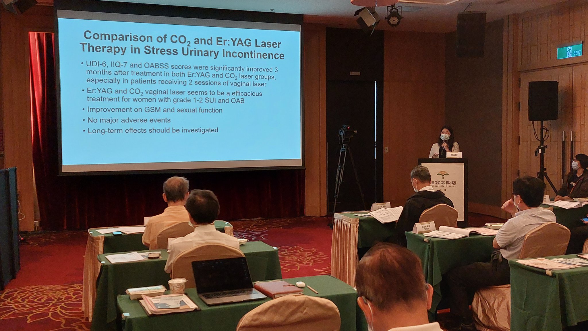 首先,由花蓮慈濟醫院婦產部主任丁大清教授主持,第一位講師是花蓮慈濟醫院婦產部婦科主任龐渂醛對女性慢性下腹痛常見的原因之一:「骨盆底肌肉筋膜炎(MFPPS)」,從症狀、診斷和治療做了完整介紹和龐主任近五年來治療MFPPS的經驗分享。龐主任特別錄製了一段影片來示範內診時如何觸診骨盆底肌肉,希望各位婦產科醫師對慢性下腹痛的病人多加注意,因為MFPPS經常沒有被診斷來,所以病人經常一直在各科求診卻沒有得到改善。另外,慈濟醫院婦產部李佩蓁醫師分享了陰道雷射用於女性輕度到中度應力性尿失禁療效和經驗。結果顯示,陰道雷射的治療效果確實不錯,若病人不想開刀的一項好選擇。