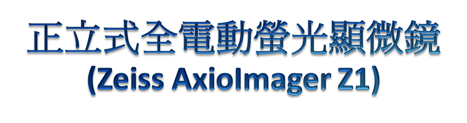 正立式全電動顯微鏡 (Zeiss Axio Imager Z1) 設有DAPI、FITC-GFP及Rhodaminn三種螢光濾片、並內建電動螢光濾片轉盤,可自動在穿透光及不同螢光間切換;堆疊不同螢光影像,幫助使用者進行多重螢光套色之實驗。
