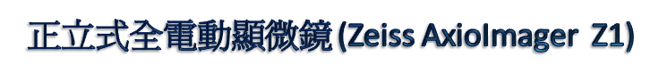正立式全電動顯微鏡 (Zeiss Axio Imager Z1) 設置於協力八樓826室,配有Zeiss AxioCam506 color及Zeiss AxioCam506 mono兩組影像感應器(CCD camera),加上10倍、20倍、40倍及100倍(oil)物鏡,可做一般穿透光及螢光的玻片觀察。