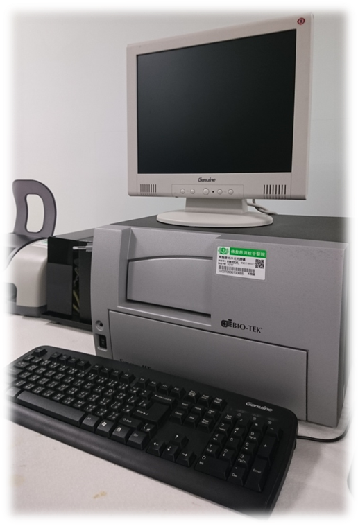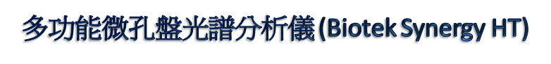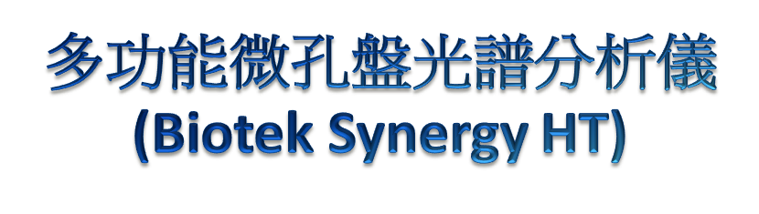 多功能微孔盤光譜分析儀 (Biotek Synergy HT)設置於協力八樓826室,採用氙氣燈及鹵素燈雙光源系統,可判讀全光譜吸收光(連續波長200nm~999nm;判讀範圍 0-4 O.D.)、濾鏡式螢光(200nm~700nm;判讀範圍 >5 decades)及冷光(300nm~700nm;判讀範圍 >5 decades)。儀器並搭配4-50℃溫控裝置、可設定時間和速度的震盪器,及兩支自動分注器。