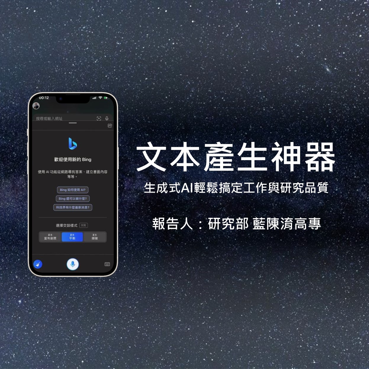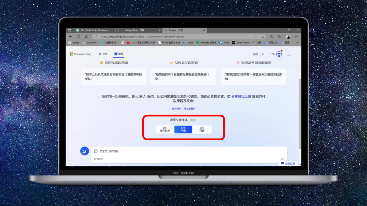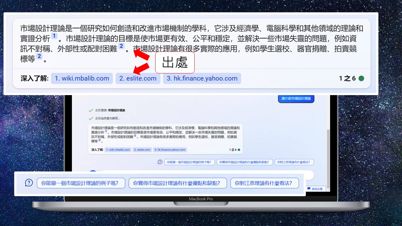 接著介紹Microsoft new Bing,Bing的回答模式分為三種風格:富有創意、平衡和精確,我個人是選擇平衡,之前試過「精確」,結果都找不到資料,我把同樣的問題問Bing,他的回答是比較正確的,而且還會告訴你出處在哪裡,另外還有一個好處是,他會建議你接下來可以問什麼問題,之前有人提到:「在這個生成式AI的年代,你要學會怎麼問問題很重要。」Bing有考慮到這個問題,滿人性化的。結論是單純從研究的角度,Bing略勝一籌。