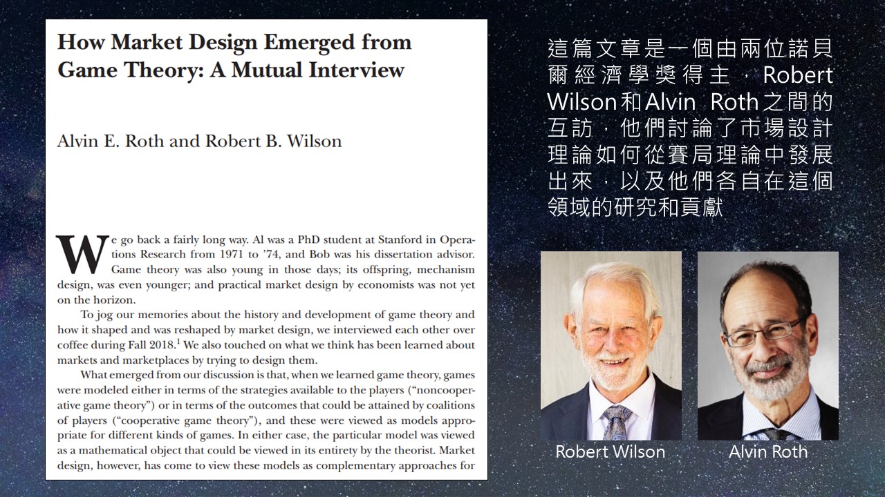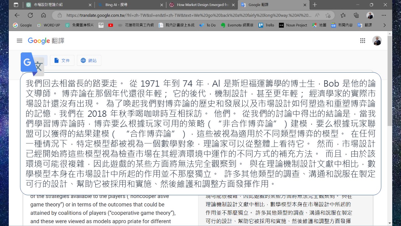 接下來要跟大家分享的是應用的部分,如翻譯、在查詢文獻時,如何請AI摘要論文、查詢專有名詞、文章整理、撰寫文案,另外我們會同場加映另一個好用的AI工具。以下我會用一篇市場設計論文來做示範。這是由二位諾貝爾經濟學獎得主的對話摘錄的綜論,他們討論市場設計理論是如何從賽局理論發展成另一個知識領域,以及他們各自在這些領域的貢獻。