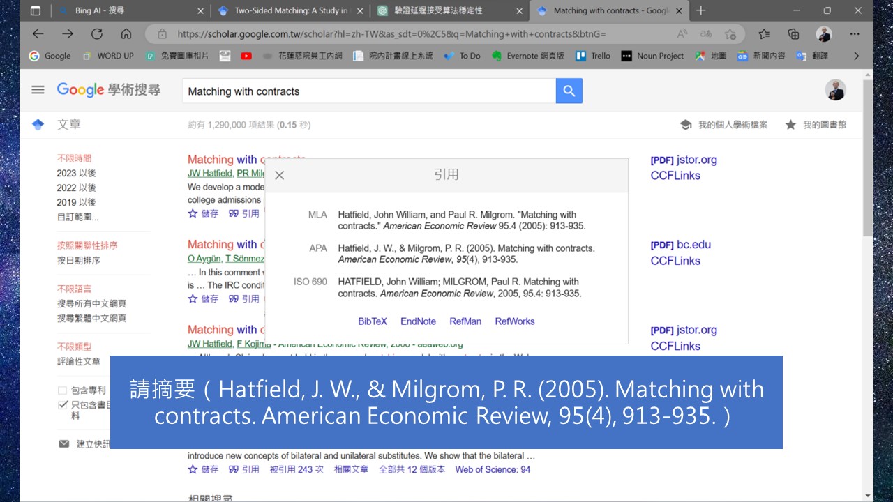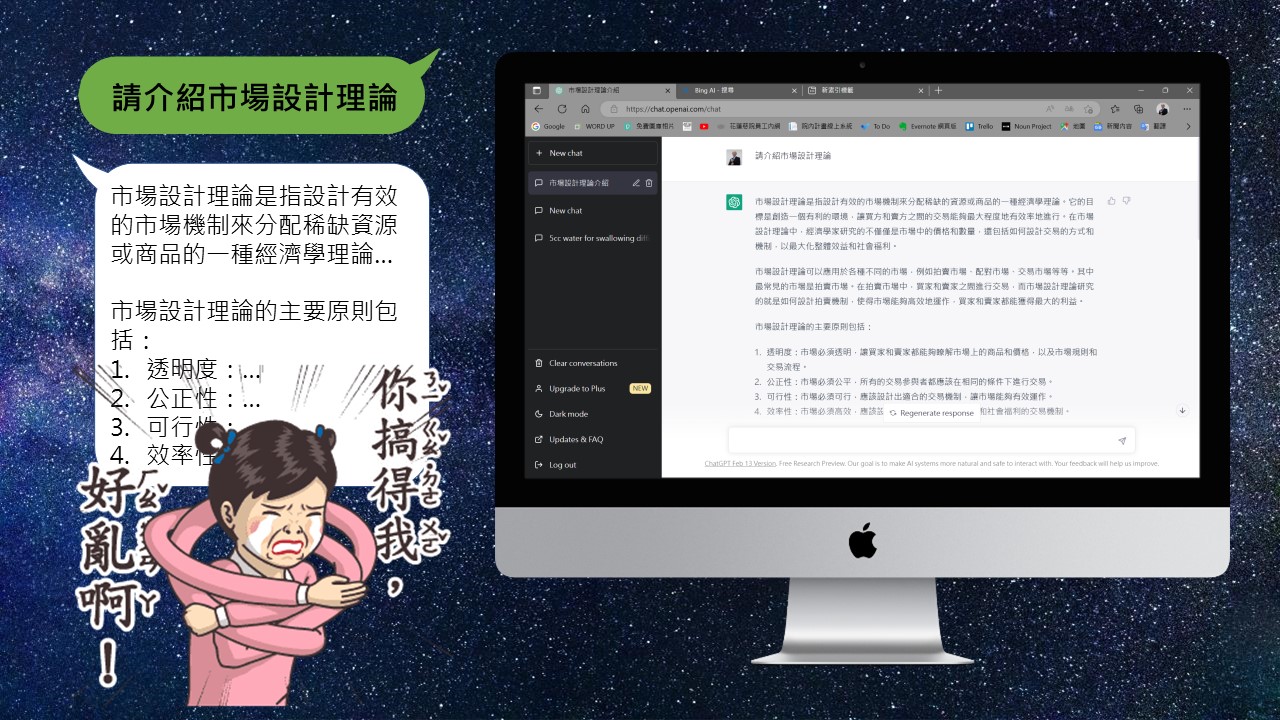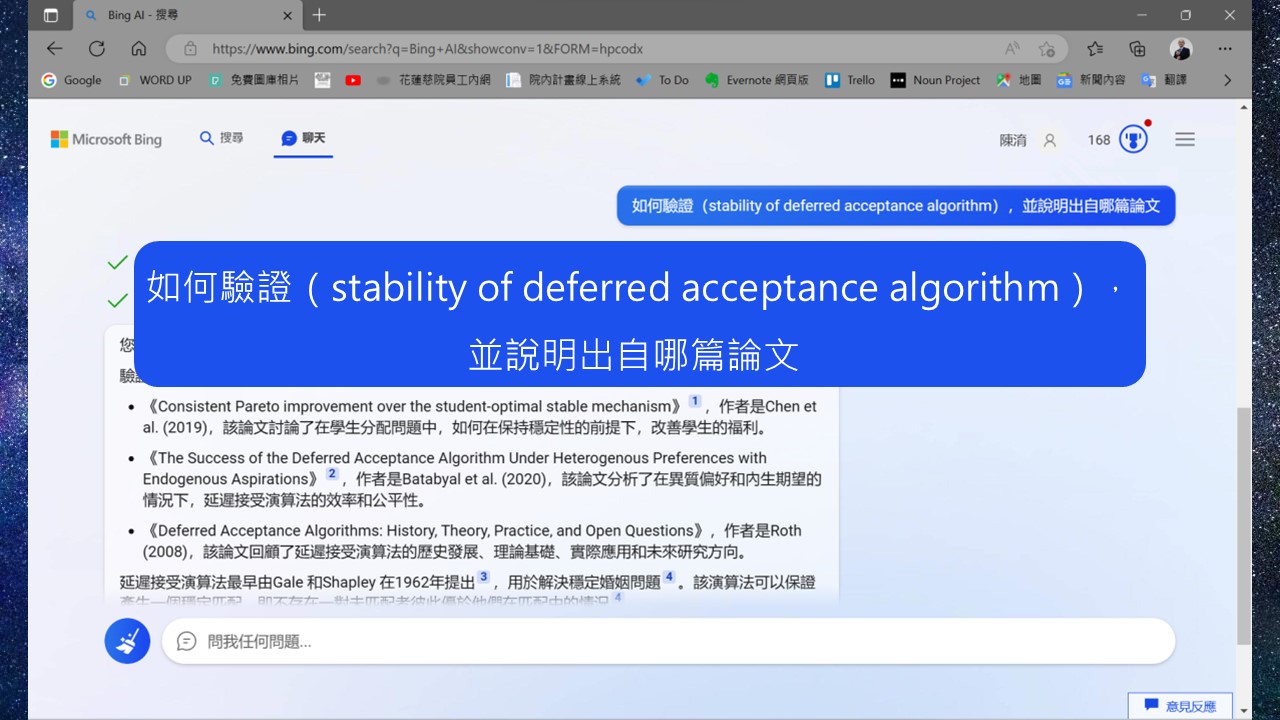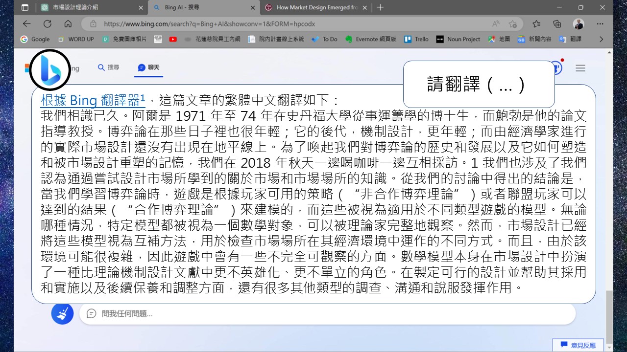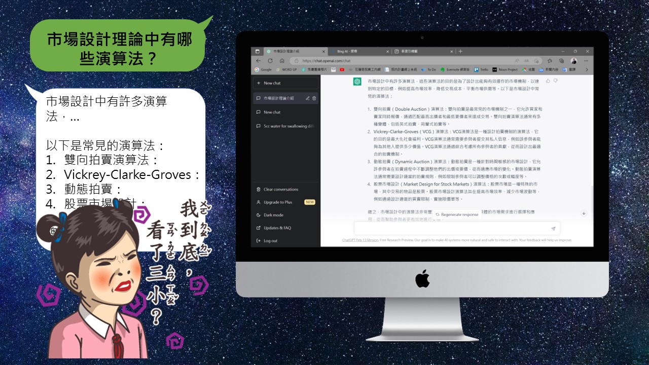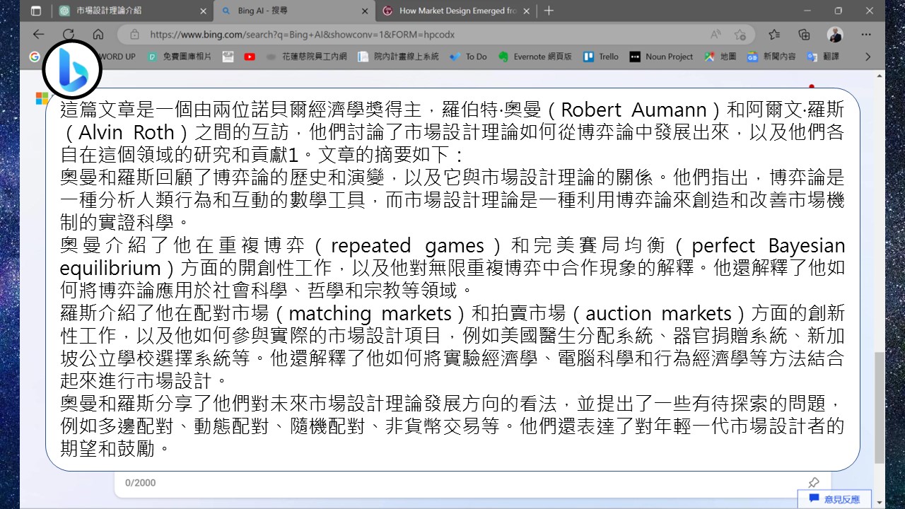 目前大多數的人會使用的生成式文字AI有二種:ChatGPT和Microsoft new Bing,我形容ChatGPT是搞創意的,而Bing則是搞學術的,怎麼說?我用我的研究主題─市場設計做說明,我比較容易判斷AI回覆的內容是否有問題。我先問ChatGPT:「請介紹市場設計理論」,他回覆我的內容,除了第一句看起來有八成對,以下的都是胡扯,我再接著問他市場設計有哪些演算法,他一樣是不知道從哪裡拼湊出來的答案,不過當我說他胡扯時,他還會回我,身為一個AI,他才沒有胡扯,而是認真的回答我的問題。