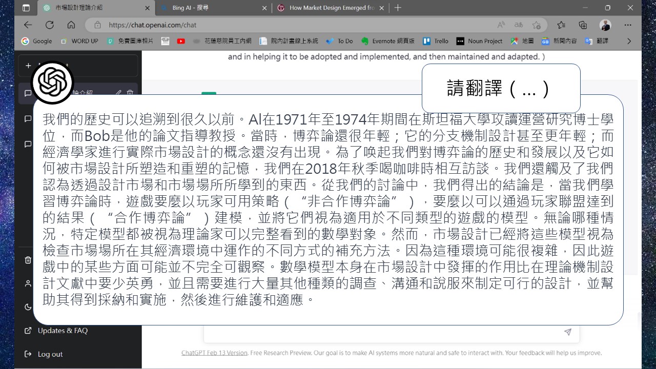 我取這篇的摘要做翻譯,我下的指令是「請翻譯( )」,把要翻譯的文字放在( )之中,目前可以放2000字,從Bing和ChatGPT的翻譯看來,內容頗通暢的,美中不足的是有些用詞是使用中國用語,如:博弈理論,在台灣,我們稱為「賽局理論」,當然在ChatGPT中,你可以用倒讚去提供給OpenAI公司修正。說到翻譯,不免要與Google翻譯做比較,我們取第一句話「We go back a fairly long way」來比較,ChatGPT翻成「我們的歷史可以追溯到很久以前」,Bing則是「我們相識已久。」,而Google說「我們回去相當長的路要走」,意思大致看得懂,但唸起來就不懂他在說什麼了!