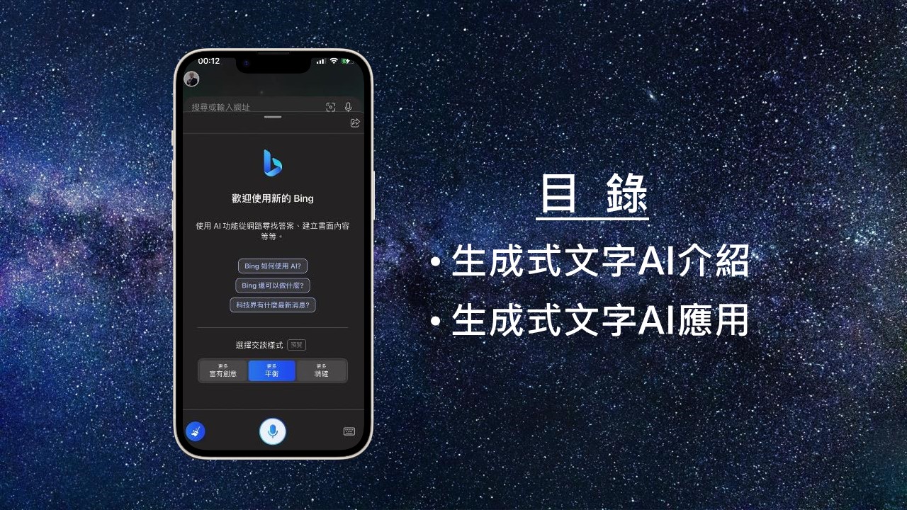 今天要跟大家分享的內容主要分為二個部份,一是生成式文字AI的介紹,另一部份是生成式文字AI的應用,目前還有生成圖像、影像的AI系統,我們今天主要是介紹文字的部份,而應用的部份是以撰寫論文可以應用的小技巧,當然還有更多的技巧等待大家挖掘,我只是把自己目前使用過的技巧提供大家參考。