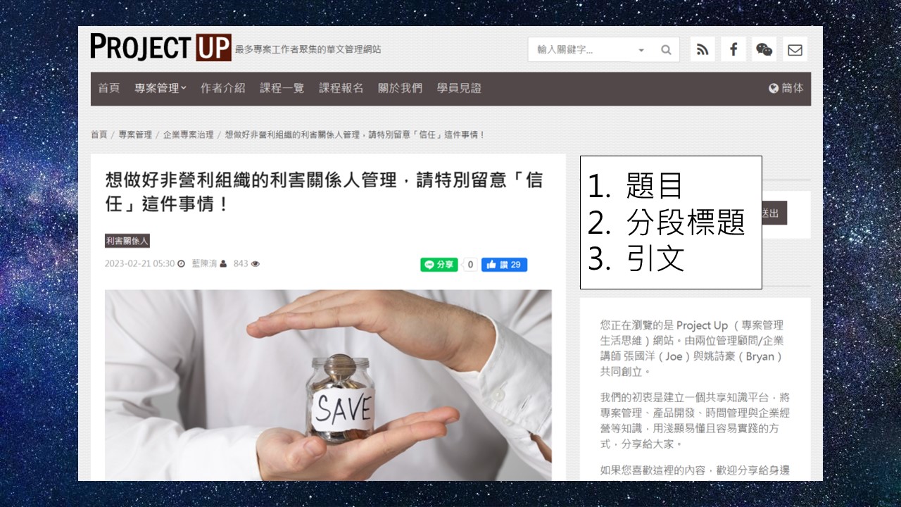 接著我要示範的如何請生成式文字AI幫忙整理文章,我以一篇我投稿在ProjectUP網站的文章做示範,內容是寫2012年美國慈善機構的募款醜聞,提到募款不易,而我從慈濟志工的角度,如何與捐款者建立信任。我把內文貼給Bing,請他幫我重訂題目、下分段標題,以及寫引文,我發覺Bing很有做小編的潛力,他下的標題是:「慈善機構的募款醜聞與非營利組織的信任危機:一位慈濟志工的觀察與反思」,一般人看到「醜聞」和「慈濟」,馬上就想點進來看,但看了以後才知道二者是不相關的,他給的分段標題與我原先的設定是一致的,甚至引文也把我的意思,精要的摘錄出來,這個我給100分。這裡再提醒大家,一次問一個問題就好,AI和人一樣,一次問太多問題,他會只回答你一個問題,其他省略。