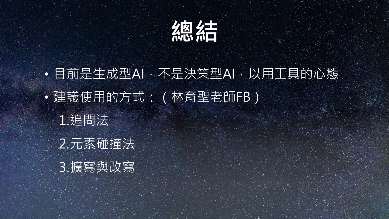 最後總結一下,目前的AI是生成式的,並非決策式,請把他當成參考工具,而不是最佳解法,我之前看到林育聖老師的使用建議,可以用追問法,先問一個比較大範圍的問題,再針對他的回答中,有興趣的內容深入詢問。第二點是元素碰撞法,先問有關的,再問無關的,再從二者中找出有趣的想法。第三個方法則是擴寫和改寫,我最後的那二個小技巧,便是用這個方式,由 AI提供內容,我再去補充和改寫。