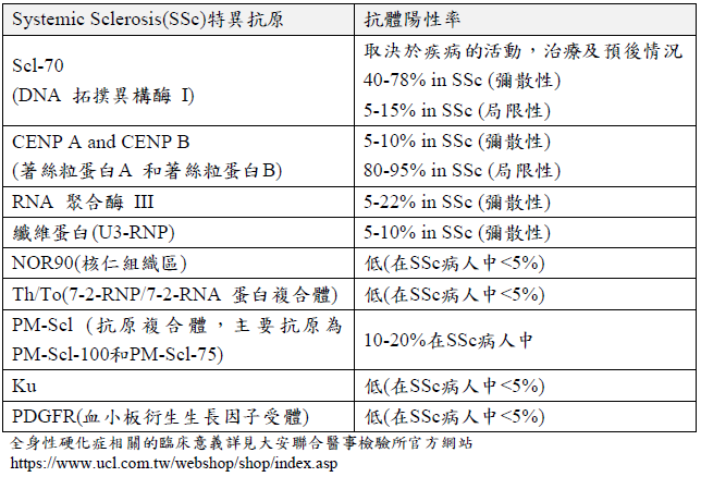 體外定性檢測人類血清或血漿中抗Scl-70、Centromere Protein A、Centromere Protein B、RP11(RNA Polymerase III subunits)、RP155(RNA Polymerase III subunits)、fibrillarin、NOR90、Th/To、PM-Scl100、PM-Scl75、Ku、PDGFR(Platelet Derived Growth Factor Receptor)及Ro-52共13種不同抗原的自體抗體IgG。上述的特異性抗體可以在95%的全身性硬化症病人中找到。