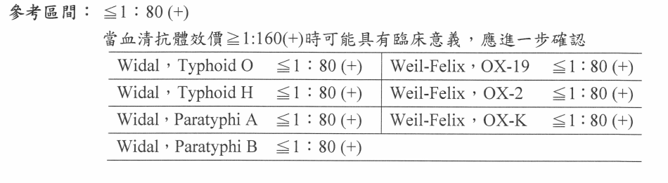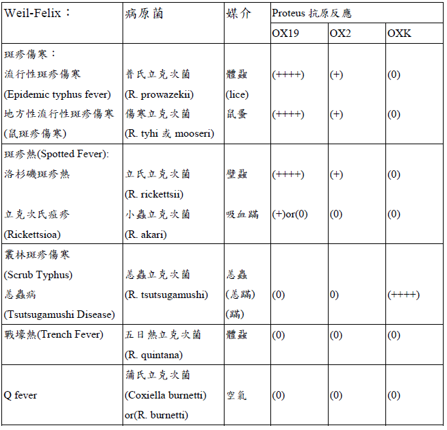 傷寒Typhoid及副傷寒、斑疹傷寒列為第二類法定傳染病、 Q fever列為第四類法定傳染病,但是Weil-Felix的檢查沒有敏感度。