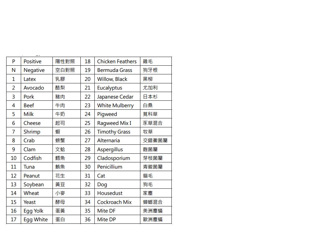 MAST Allergy可同時檢測36種過敏原項目,檢驗項目如下表: