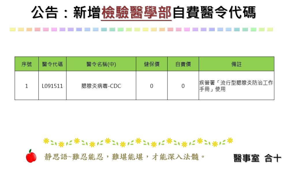 公告編號12:新增【檢驗醫學部】自費醫令代碼「L091511 腮腺炎病毒-CDC」