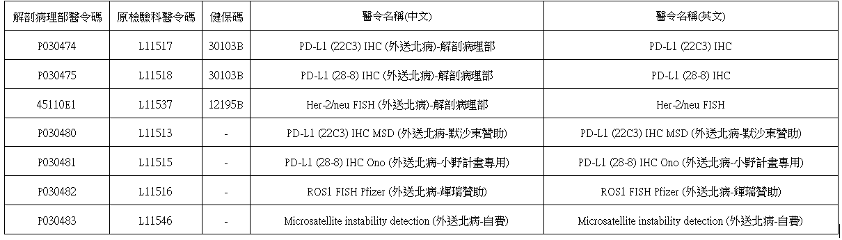 自114年6月11日起,原由檢驗醫學科外送至台北病理中心執行之七項檢驗項目(含 PD-L1 系列、HER-2/neu、MSI、ROS1 等),已正式交接由解剖病理部執行,檢驗醫學科不再受理該項目。